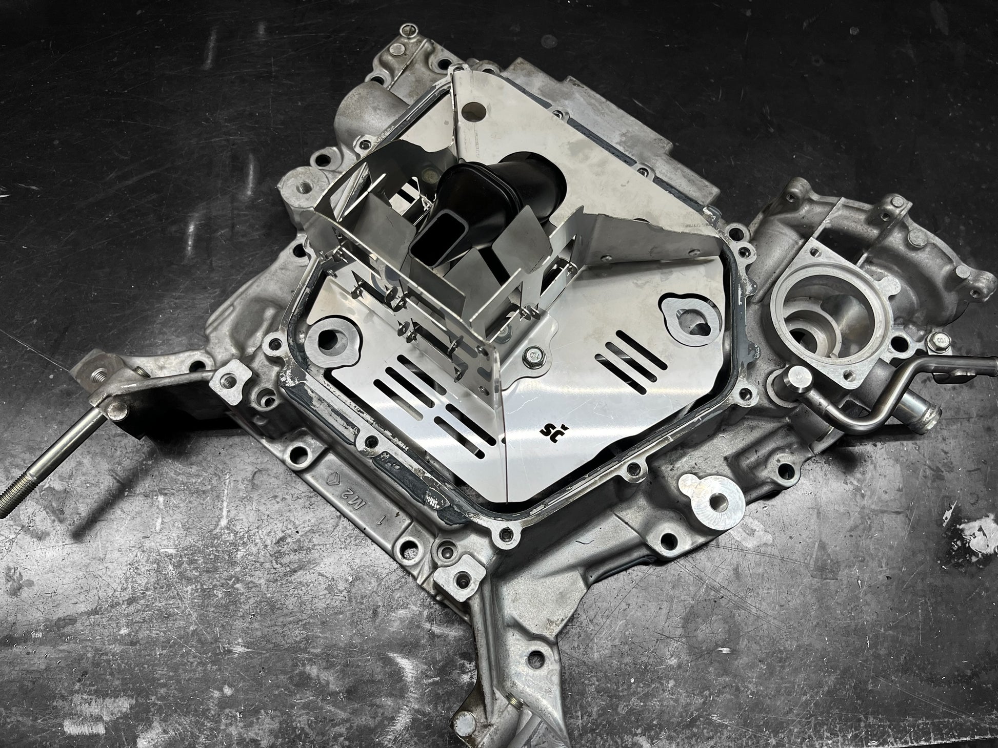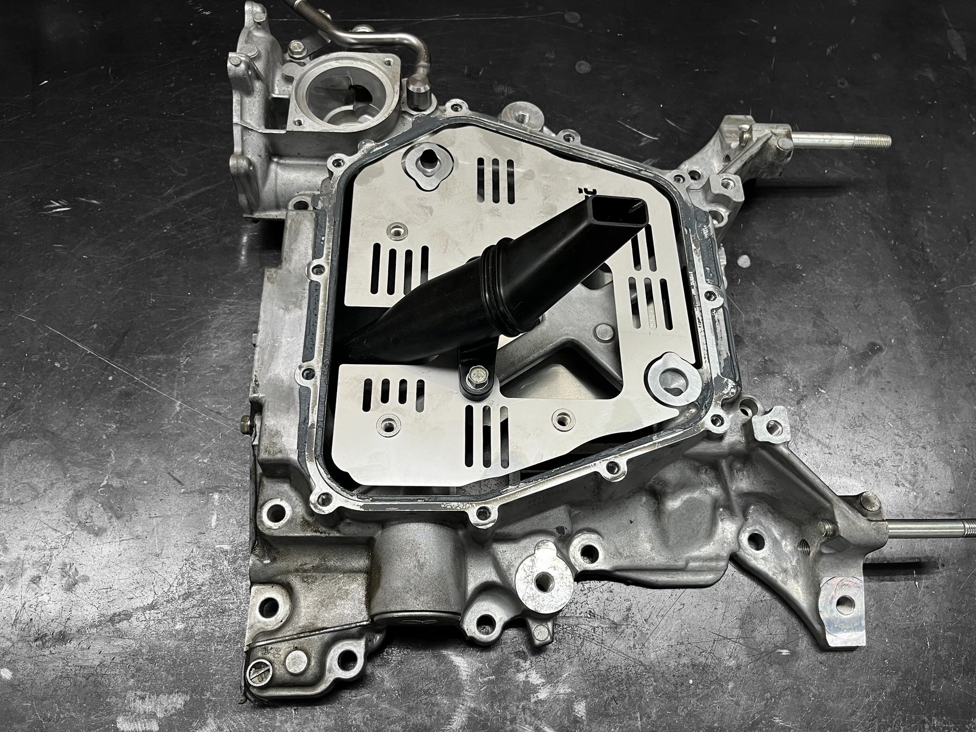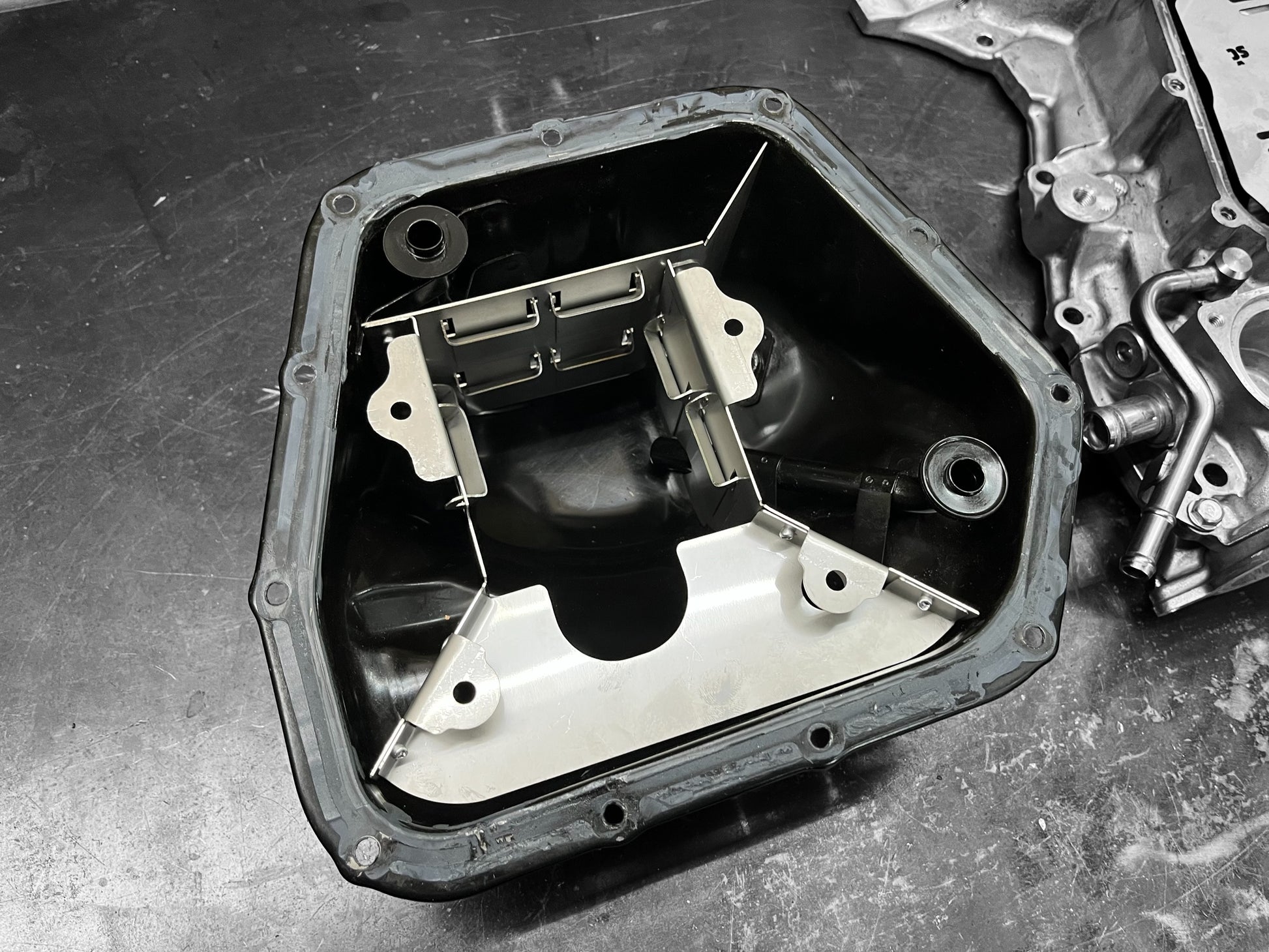 This oil control baffle is engineered to keep oil precisely where it’s needed — around the oil pickup — even under aggressive acceleration, braking, and cornering. The internal design uses one-way trap doors integrated into the partition walls, allowing oil to flow toward the pickup while preventing it from sloshing away.
